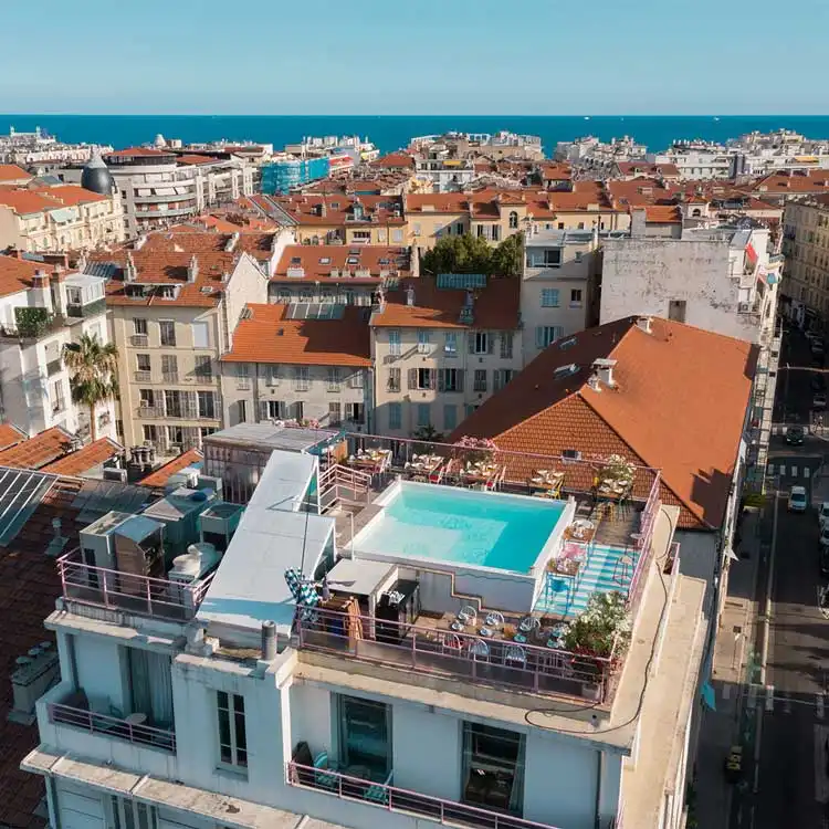 Proche de la Promenade des Anglais, l'hôtel Amour de Nice est un havre de paix en plein quartier des Orangers. Une Taverna grecque en guise de restaurant, avec un patio très lumineux. Des décorations faite à partir de meubles et d'objets collectionnés au fil des années. Au 7ème étage de l'hôtel, un rooftop, ouvert de mai à septembre, avec une vue à 360° sur Nice. Dans des tons roses, bleus ou crème, les chambres vous invitent au repos et à la relaxation. Besoin de vacances, pour un week-end ou bien un séjour en famille…